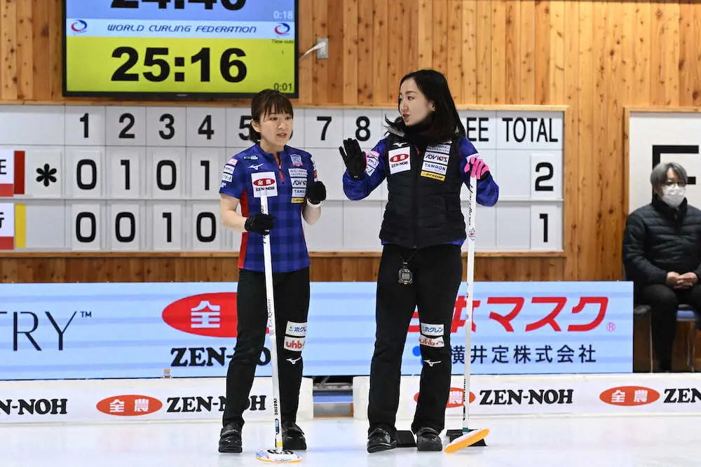 北海道銀行戦で話し込むロコ・ソラーレの藤沢(右)と鈴木(C)JCA IDE
