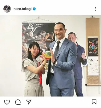 メダルを手に笑顔の高木さんと、紙風船を手で挟みながら笑顔の室伏長官に加え、背後に室伏長官のパネルが置かれる“3ショット”。身長が高木さんが1メートル55、室伏長官が1メートル87のため、フォロワーからは「室伏さん、菜那さんがお世話になりました。ありがとうございました」「身長差が萌えます」「いい写真 いい笑顔」「圧倒的な身長差ですが、2人とも季節は違いますがオリンピックの金メダリストですね」「室伏さん大きいなぁ ななちゃんは相変わらずかわいいね」などの声が寄せられていた。