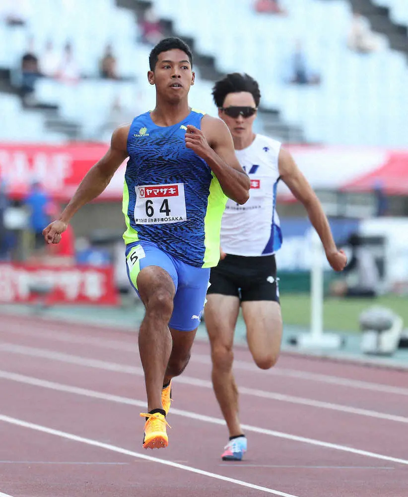 <第106回陸上日本選手権第1日>男子100メートル予選5組で、1位で準決勝進出を決めたサニブラウン(手前)(撮影・坂田 高浩)
