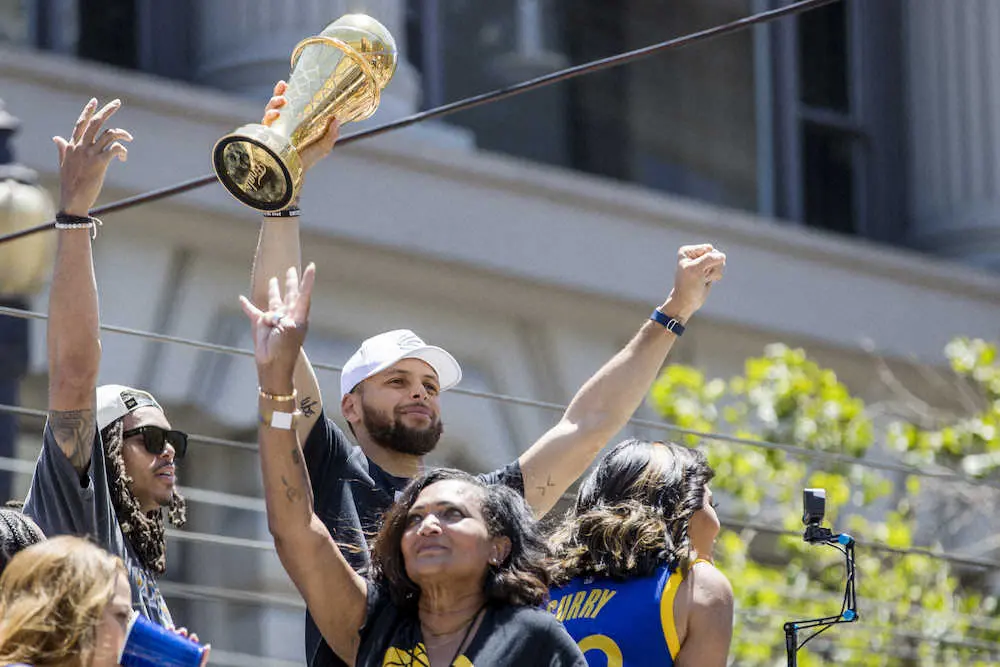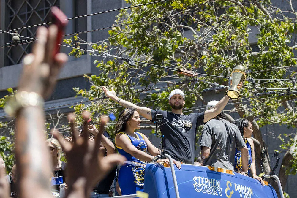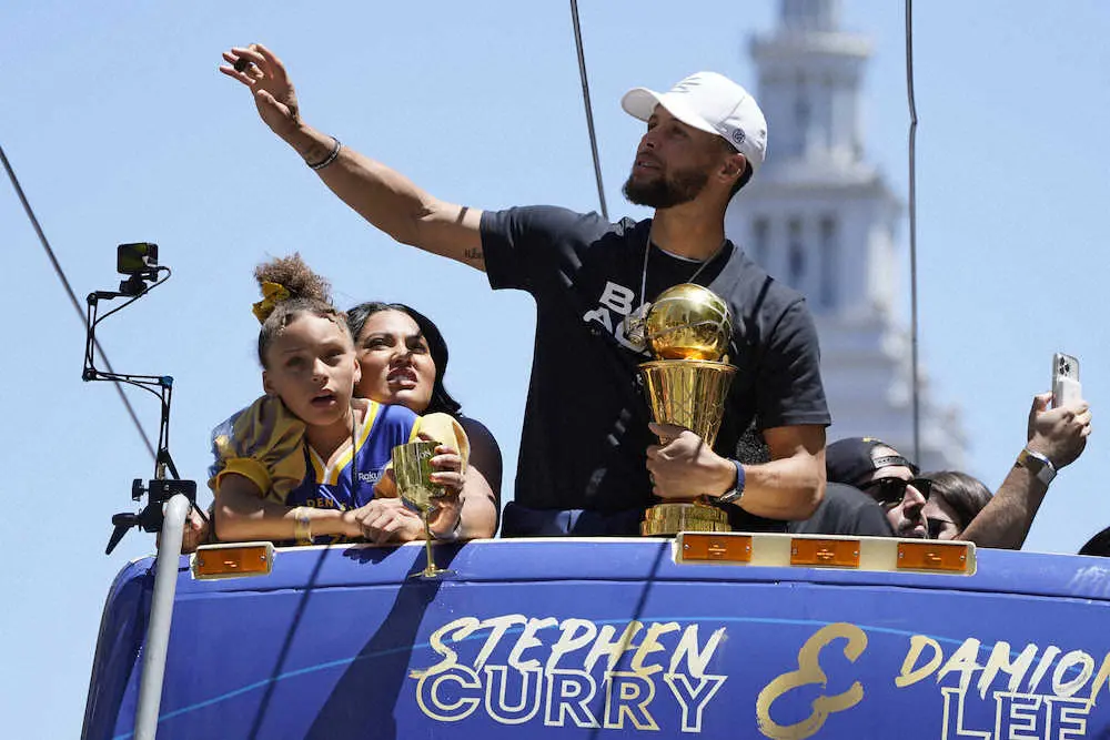 パレードで優勝トロフィーを掲げるウォリアーズのカリー(AP)