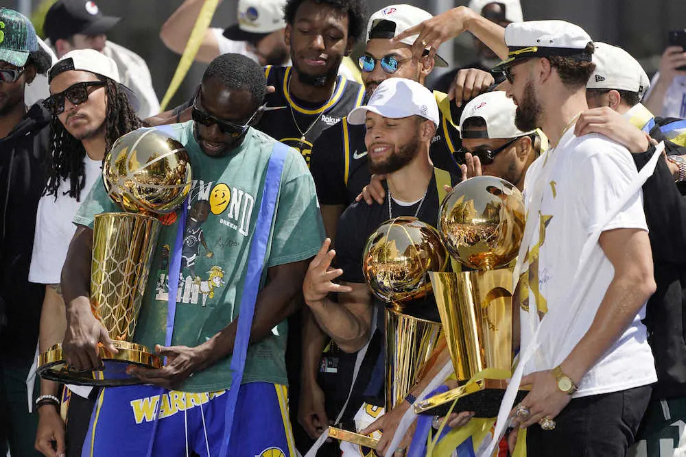 過去の優勝トロフィーも手にしてステージに上がったカリー、グリーン、トンプソン(AP)