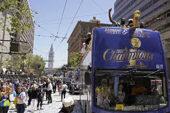 NBAファイナルでセルティクスを4勝2敗で下して4年ぶり7回目の優勝を飾ったウォリアーズの優勝パレードが快晴となった20日にカリフォルニア州サンフランシスコで行われ、二階建てバスに選手たちが紙吹雪が舞う中で姿を現わすと、沿道を埋め尽くした地元ファンから大歓声が沸き起こった。