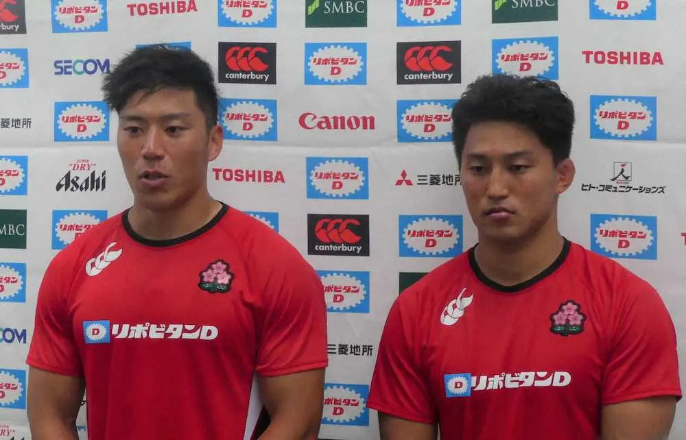 練習後の囲み取材に応じたラグビー日本代表の中野(左)と古川