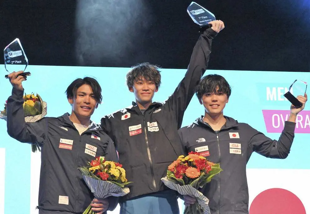 ボルダリングの年間総合の表彰式で喜ぶ(左から)2位の楢崎智亜、優勝した緒方良行、3位の藤井快