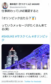 「サスケ君」はツイッターに「仕事終わってLINE確認すると オリンピック出たら? っていうメッセージがたくさん来てる(笑)」とつぶやき、続けて「フェンシングとか射撃があるので、さすがに専門でやってる方々には敵わないと思いますが、とても夢のある話ですよね オリンピックの舞台でそり立つ壁やクリフハンガーが見られる日がとても楽しみです」と投稿した。