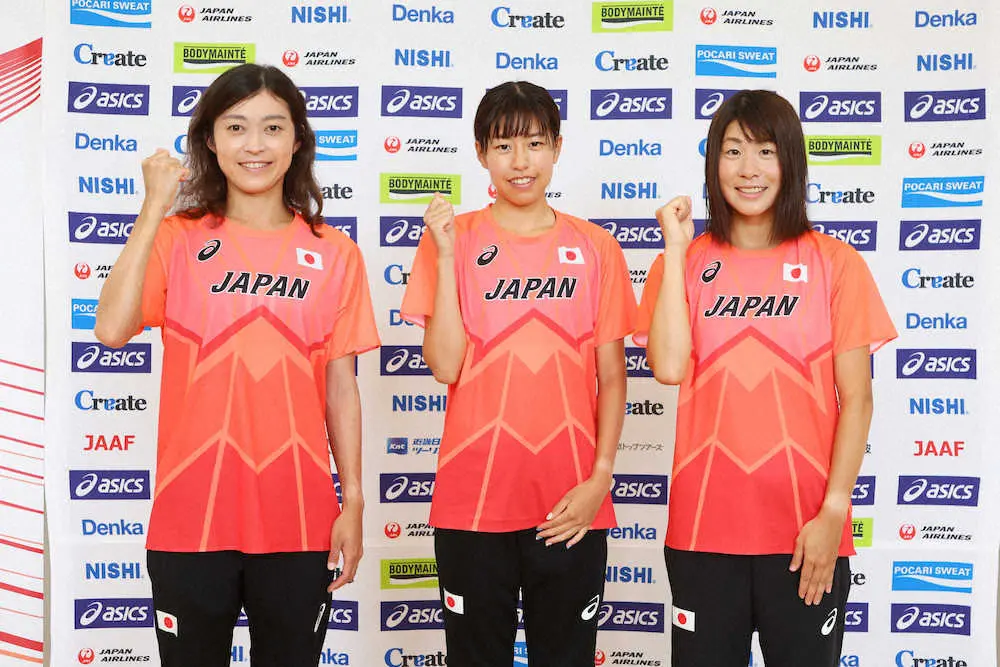 公開練習後に撮影に応じる競歩日本代表女子の(左から)岡田、藤井、園田(提供:日本陸上競技連盟/アフロスポーツ)