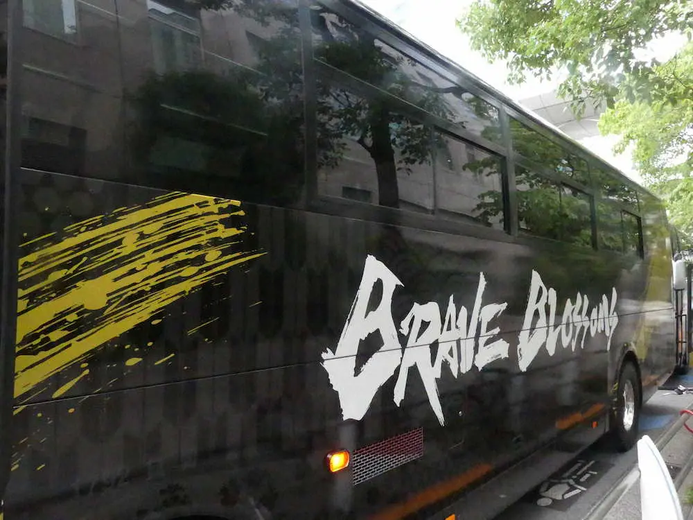品川駅からは、桜のエンブレムや「BRAVE BLOSSOMS」の文字で外装された専用のラッピングバスを利用。この日が初披露で、選手やスタッフは写真撮影するなどリラックスした表情で乗り込んだ。