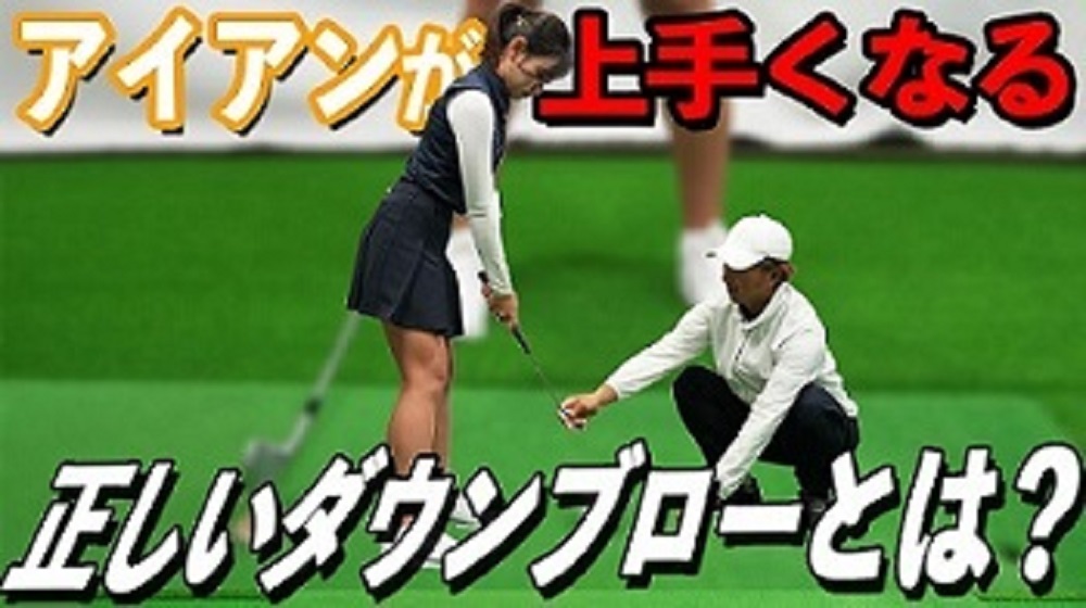 多くの人は、アイアンショットはダウンブローで打つべきだと認識しています。しかし、どの程度の角度でクラブをおろしてくるかまで理解している人は少ないでしょう。そこで今回のテーマは正しいダウンブローについてです。奥嶋誠昭コーチによれば、結構緩やかな角度とのこと。まずはゴムティーを使ってどれだけの角度でおろせば良いのか体感してみましょう。日大ゴルフ部OGの加藤みなみさんがアシスタント役を務めます。
