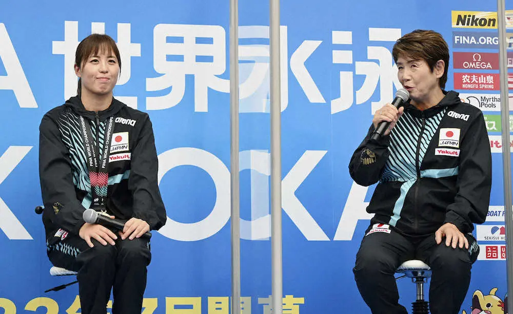水泳の世界選手権福岡大会開幕まで1年となった14日、福岡市のJR博多駅前でトークイベントが行われ、6月の世界選手権アーティスティックスイミング(AS)のソロ種目で2冠に輝いた乾友紀子(井村ク)は「金メダルを獲得したことで次は胸を張って戦える。日ごろ応援してもらっているみなさんの前で演技できることが楽しみ」と笑顔で話した。