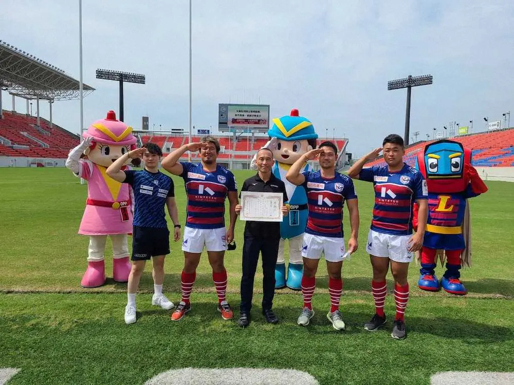今年12月に開幕する新シーズンからラグビーリーグワン1部に昇格した花園(旧近鉄)は18日、東大阪市にある本拠地、花園ラグビー場で大阪府警察本部少年課から感謝状を授与された。花園のプロップ浅岡勇輝(29)、フランカーのジェド・ブラウン(31)、CTB/WTB森田尚希(25)、WTB/FBジョシュア・ノーラ(26)が大阪府警察本部少年課が推進する大麻乱用防止啓発運動のための動画に出演。その功績が評価された。