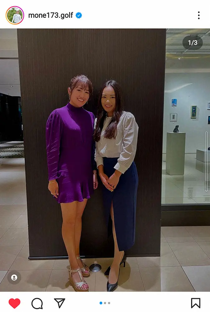 稲見は「today」とつづり、パープルのミニドレス姿を披露。ブルーのスカートのスリットから美脚をのぞかせた河本結(23=リコー)、清楚な水色のドレス姿の山下美夢有(20=加賀電子)と並ぶ写真などを投稿した。