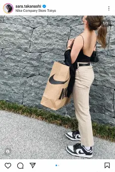 高梨はポニーテールの髪形にキャミソールにホワイトデニム、ナイキのスキーカー姿を披露し「最近毎日履いてるお気に入りのダンク。に良くないことはわかっているけど、結局選んでしまいます…」とし、お気に入りデニムに「お気に入りにお気に入りを重ねた服装を誉めて頂けて嬉しかった昨日でした」と続けた。