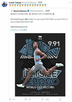 陸上のU20(20歳未満)世界選手権は2日、コロンビアのカリで行われ、男子100メートル決勝でレツィレ・テボゴ(19=ボツワナ)が、U20世界新記録となる9秒91をマークして金メダルを獲得した。