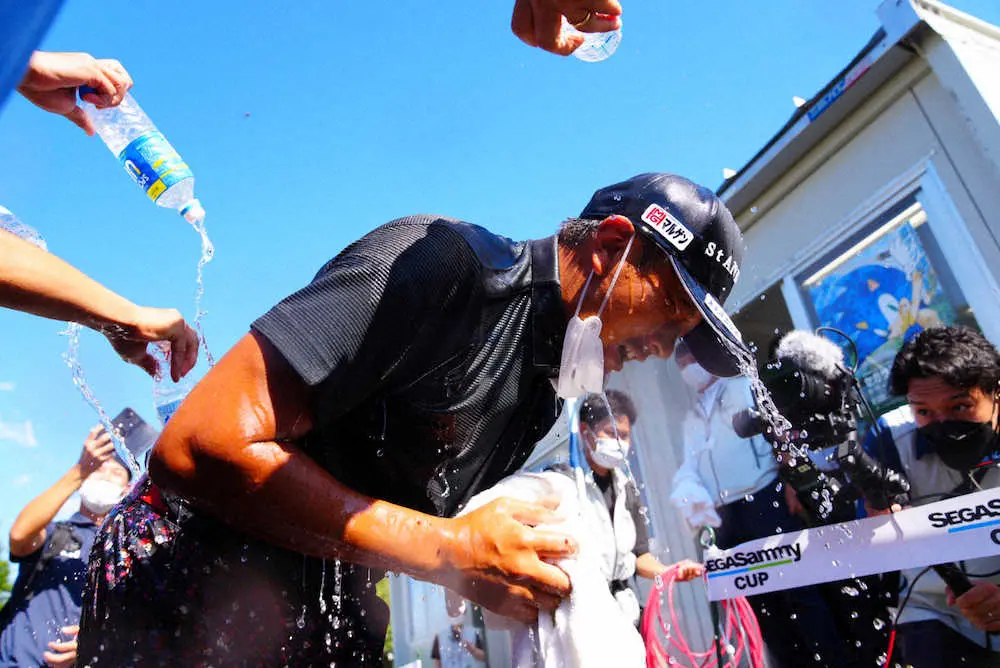 優勝しウオーターシャワーで祝福される岩田(撮影・西尾 大助)