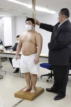 ▽新弟子検査の体格基準 12年夏場所から、1メートル67、67キロ以上(毎年春場所は中学卒業見込み者に限り1メートル65以上)で合格という規定に。それ以前は1メートル73、75キロ以上が基準だった。過去には舞の海(現タレント)が頭にシリコーンを入れて身長を伸ばしたことや、1メートル63の爆羅騎(ばらき、現三段目)が背伸びをして合格した例もある。
