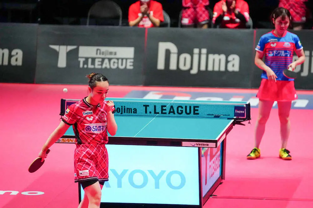 Tリーグ初参戦の伊藤が、ファンが最も期待していた“みうみま”対決を制した。小学時代からコンビ、ライバルとして切磋琢磨(せっさたくま)してきた平野との一戦は、日本生命が2―0とリードした第3マッチ。第1ゲームを7―11で落とした伊藤だが、「1点を取ることだけに集中」して3ゲームを連取。逆転勝ちでチームの勝利を決めた。