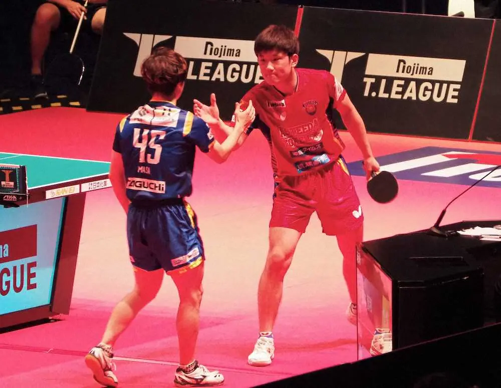<ノジマTリーグ 琉球×岡山>ゲームカウント3―0で圧勝し、岡山の森薗政崇(左)と握手する張本智和