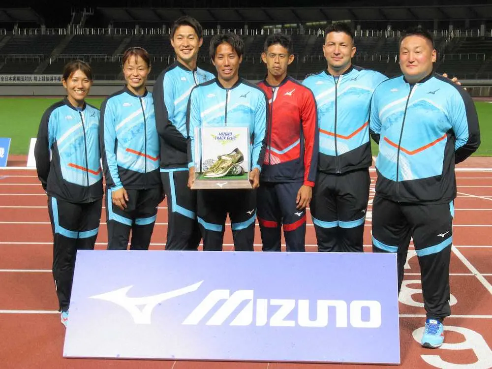 全スケジュールを終えた後に、所属するミズノが競技場内で実施。同僚の飯塚翔太やディーン元気、児玉芽生らが参加し、松下に対してミズノから金色のスパイクがプレゼントされた。