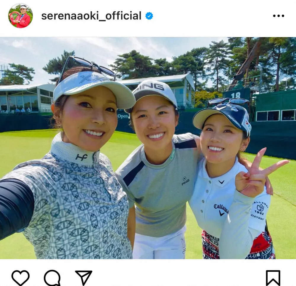 今季メジャー第3戦が29日から開幕。青木は「練習日の今日はにゃにゃこと、ゆなぱんと」とつづり、練習ラウンドのオフショットとして西村優菜(スターツ)と上野菜々子(コーナン)との3ショットを添えた。