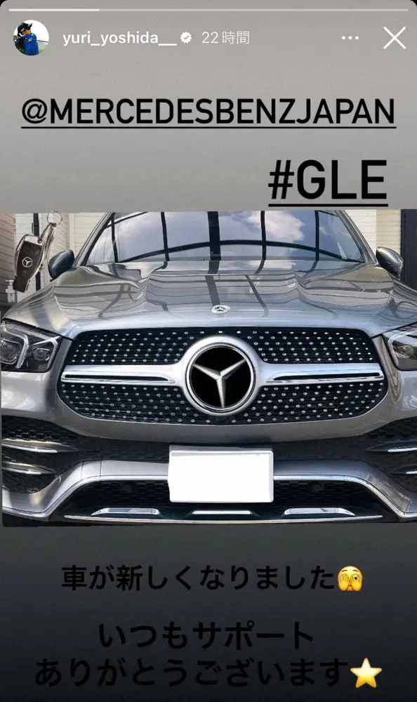 メルセデス・サポート選手の吉田は、「車が新しくなりました。いつもサポートありがとうございます」とつづり、愛車のベンツを披露。ハッシュタグには「#GLE」と添えた。