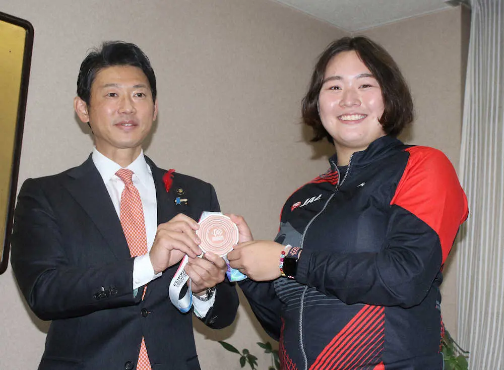 市役所で今津市長に銅メダルを見せると「昨年は(東京)五輪の報告でメダルは獲れなかったが、今回はメダルを持って帰ることができた」と笑顔。来季の目標について「(世界選手権で)メダルを獲りにいきたい。今回よりもいい色のメダルを」と語った。