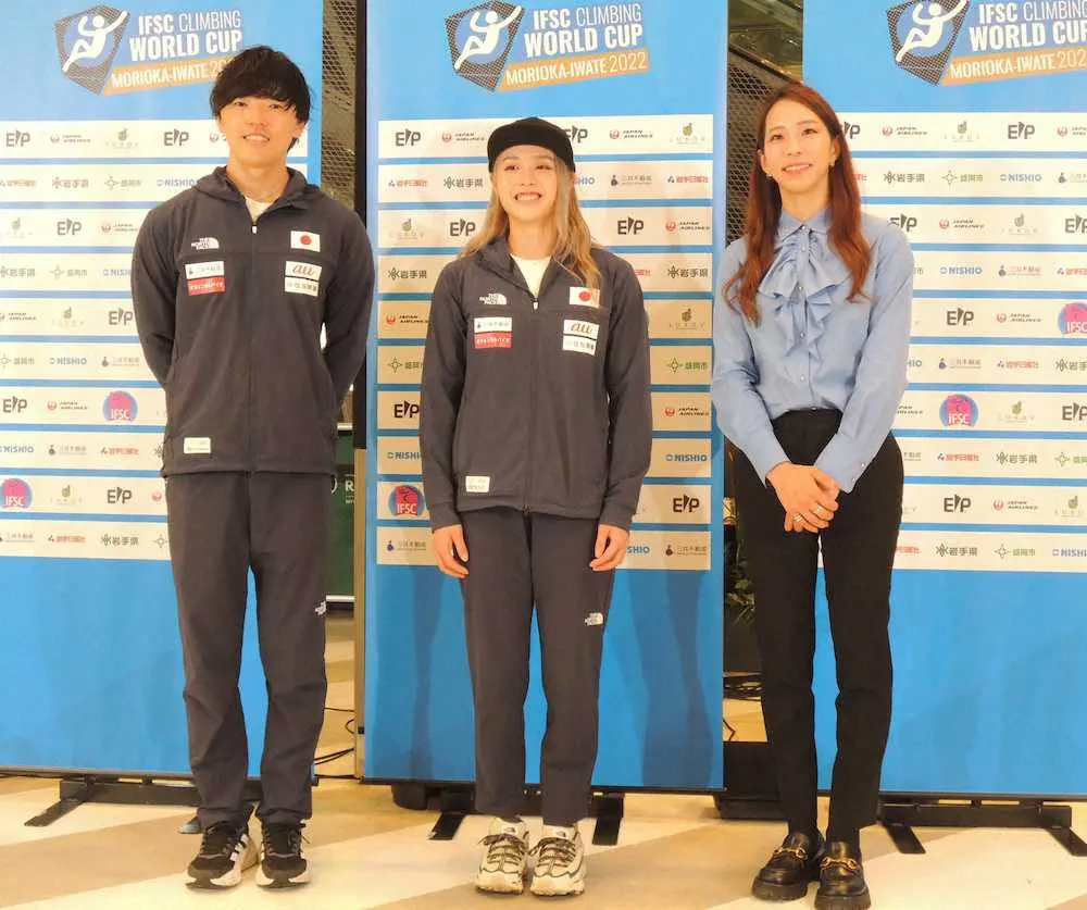 IFSC クライミングワールドカップ B&L コンバインドいわて盛岡2022開催記者会見に出席した(左から)藤井快、伊藤ふたば、野口啓代さん