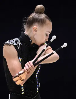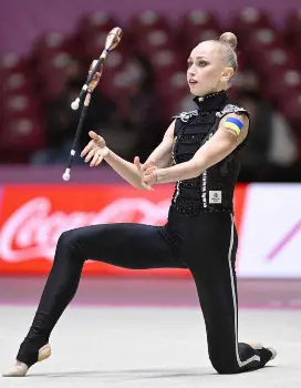 新体操のイオンカップ2022世界クラブ選手権最終日は23日、東京都渋谷区の東京体育館で決勝ラウンドの後半2種目が行われ、ロシアによる侵攻が続くウクライナから参加したデルギナ・スクールは、シニア2人、ジュニア1人の合計得点で争われるクラブ対抗で銀メダルを獲得。シニア個人総合でもビクトリア・オノプリエンコ(19)が銀メダル、ジュニア個人総合ではタイシア・オンフリチェック(14)が金メダルと奮闘した。
