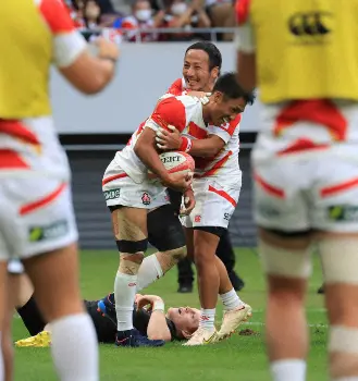 だが19年W杯日本大会で8強入りを果たし、近年めざましい躍進を遂げている日本代表は諦めなかった。36分、自陣のディフェンスでフランカー姫野がターンオーバーに成功すると反撃開始。徐々に前進すると、右サイドでCTBライリーが蹴ったボールの処理を相手が手間取るところに山沢が足を差し出し、インゴール手前で拾って反撃のトライ。前半終了間際には連続攻撃で徐々に相手ディフェンスラインを崩すと、FB山中、CTB中村、ライリーとパスをつなぎ、最後は内側をサポートしたSH流がチーム2トライ目。一気に4点差に迫り、前半を終えた。