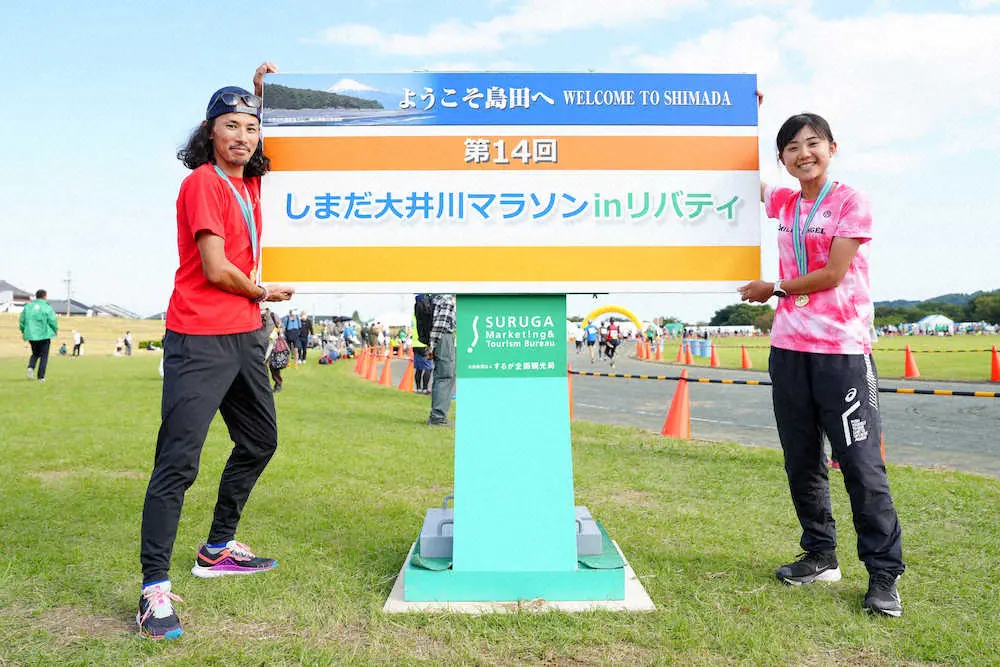 「第14回しまだ大井川マラソンinリバティ」(スポニチ共催)は30日、静岡県島田市第三小前をスタートし、大井川沿いのマラソン専用コース「リバティ」を経て同市陸上競技場をゴールとする42・195キロなどに6456人がエントリーして行われた。男子フルマラソンは曽宮道(そみや・とおる、42=静岡)が2時間26分25秒、女子フルマラソンは松井美來(みくる、24=静岡)が2時間56分10秒でそれぞれ初優勝。10キロ男子は滑(なめら)和也(35=北海道)が30分32秒、女子は磯部元美(40=静岡)が37分8秒でともに初優勝。大会アドバイザーの千葉真子さん(46)らが参加し、盛り上げた。(詳細は11月2日付紙面に掲載予定)。