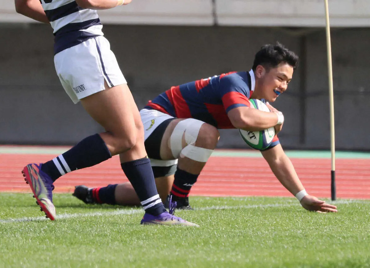 前半18分にPGで先制しながら、その直後にトライを奪われ3―7と逆転される。迎えた前半の終了間際、敵陣に攻め込み、SO池沢佑尽(3年=東福岡)がゴール手前にキック。これが思わぬ方向にバウンドし、キャッチしたSH末井健将(3年=報徳学園)がトライを決めて逆転した。