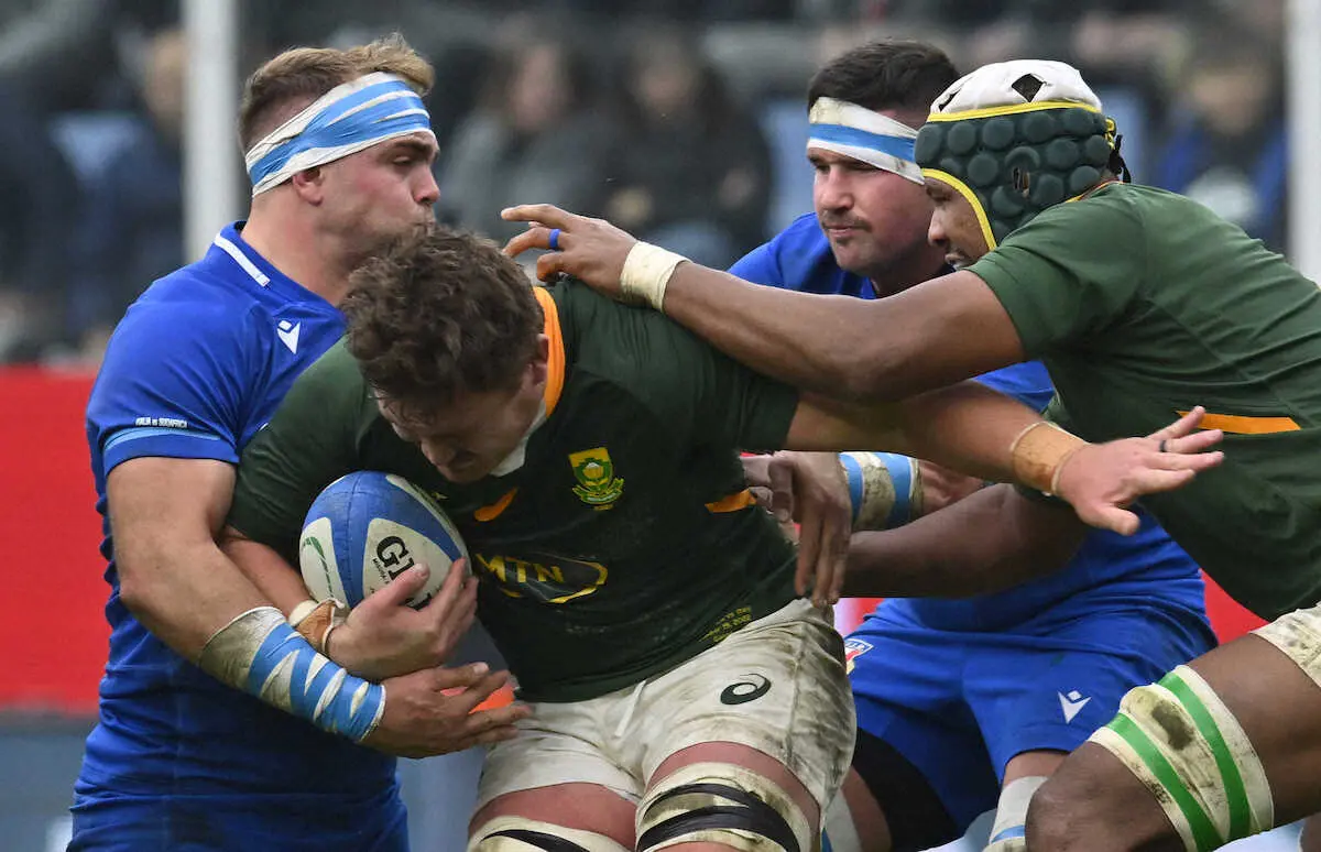 フランカーのモスタート(三重)、SHデクラーク(横浜)ら日本のリーグワン所属選手5人が登録メンバーに名を連ねた南アフリカは、開始直後にWTBアレンゼが4試合連続のトライで先制。幸先のいいスタートを切ったに思われたが、前週にオーストラリアを史上初めて破ったイタリアの勢いは本物だった。8―3で迎えた前半10分、今年のワールドラグビー(WR)ブレークスルー選手賞の候補に挙がっているFBカップーゾに鮮烈なトライを許して逆転を許すと、10分後にもPGを加えられ、一時5点のリードを許した。