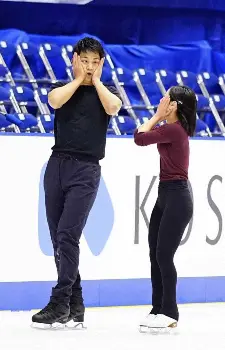 コーチと話しながらリフトなどの動きを確認。曲かけでは、スロージャンプやリフトなどで息の合った姿を見せた。30分間の練習時間の中でお互いに笑顔も浮かべ、やや早めにリンクを後にした。