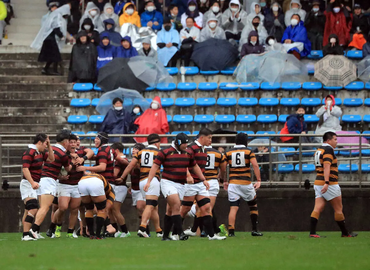 <慶大・早大>雨天もあり薄暗いグラウンド。後半、逆転トライを決め歓喜する早大・佐藤(左から3人目)ら。右は前半トライを決めた慶大・松岡(撮影・久冨木 修)