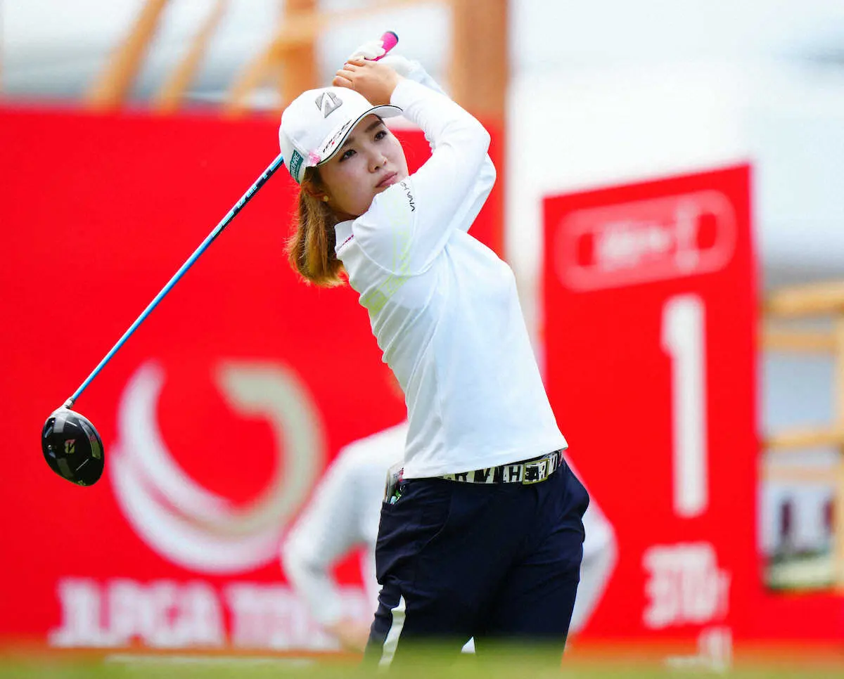 プロアマでティーショットを放つ古江彩佳(撮影・西尾 大助)