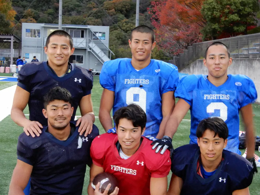 打倒・立命大へ、団結を誓う関学大QB鎌田(前列中)とWRクインテット(前列左から時計回りに衣笠、糸川、河原林、梅津、鈴木崇)