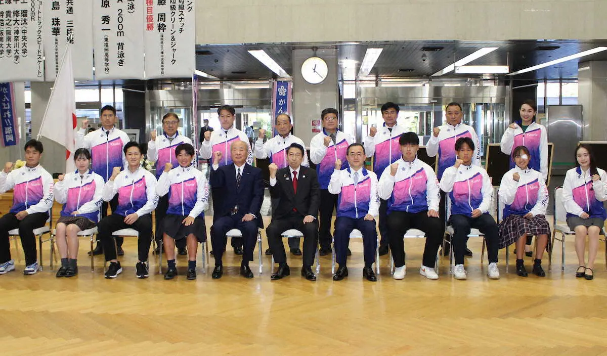 栃木国体ゴルフ女子個人優勝の左奈々(前列左から2人目)はほかの優勝者・団体とともに服部知事(中央)に優勝を報告する