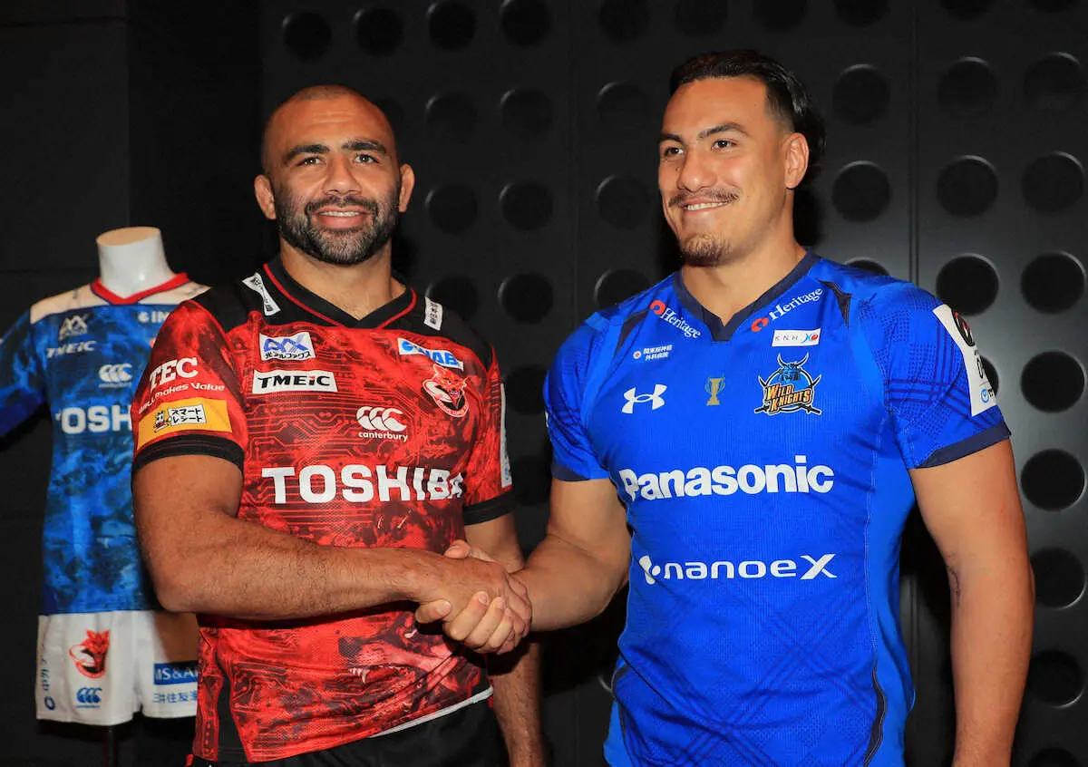 <リーグワン・プレスカンファレンス>開幕戦で対戦するBL東京・リーチ(左)と埼玉・ガンター(撮影・篠原岳夫)