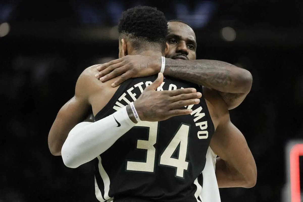 バックスのG・アデトクンボと試合後に健闘を称え合うジェームズ(AP)