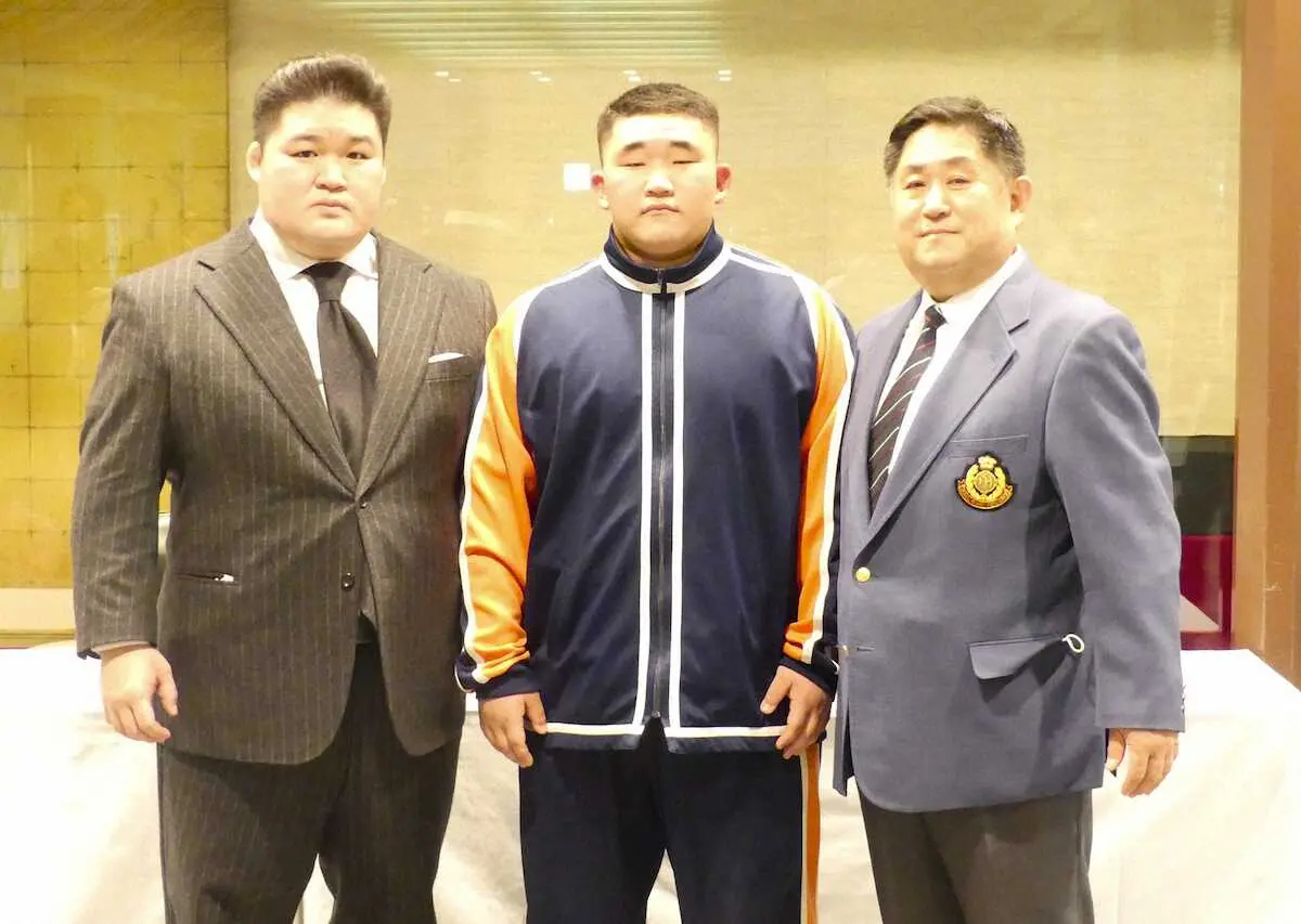 (左から)元大関・豪栄道の武隈親方、埼玉栄高3年の高山瞬佑、埼玉栄高相撲部の山田道紀監督(撮影・前川 晋作)