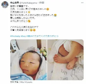 夫の中山も自身のツイッターで「先日、中山家に第1子が産まれました 元気な男の子です」と報告。「我が子と対面したときには思わず泣きました 妻には感謝しかないです。本当にありがとう」とつづり「これからも夫婦力を合わせて子育ても頑張ります」と生まれたばかりの我が子の写真を添えて投稿した。