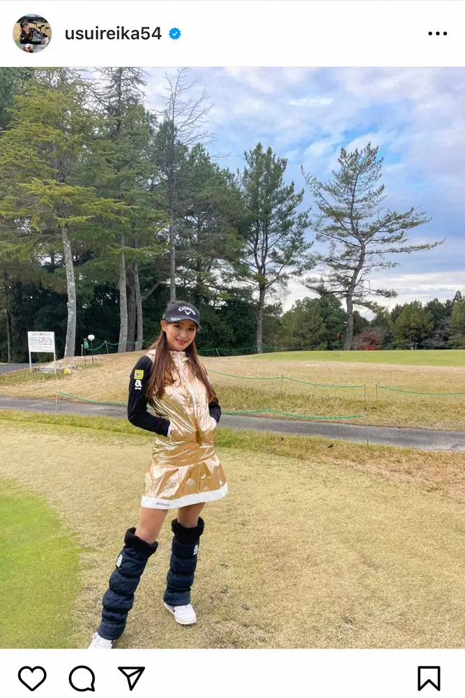 ハッシュタグに「#来シーズンへの準備#12月イベント始まりました!#誕生日week」と添え、ド派手なゴールドのミニスカゴルフウエア姿で笑顔を浮かべるショットを披露した。
