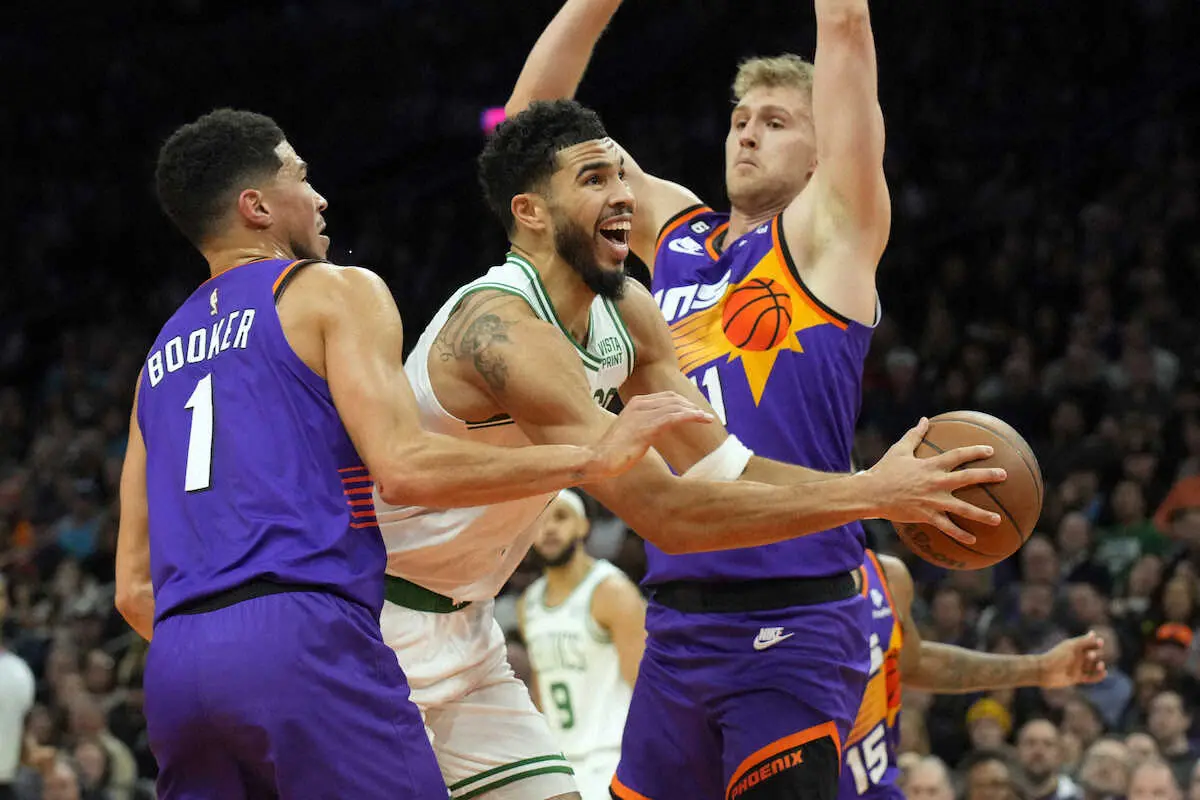 NBAは7日に各地で11試合を行い、アリゾナ州フェニックスでは東西両地区の全体1位同士が対決。勝ったのは東のセルティクスの方で、ジェイソン・テータム(24)とジェイレン・ブラウン(26)の二枚看板がそれぞれ25得点を挙げて、125―98(前半69―42)と予想外の大差で快勝した。