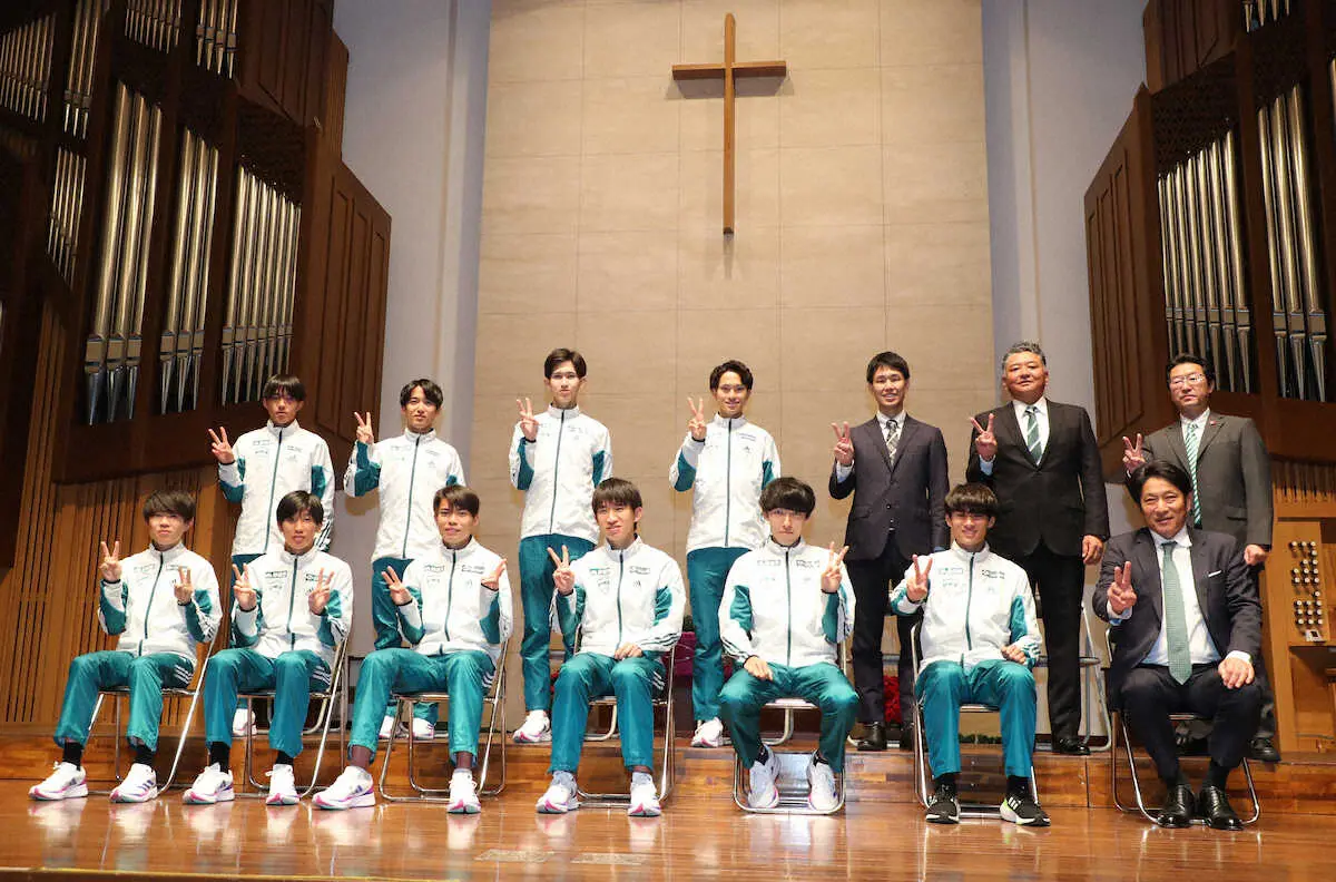 <箱根駅伝・青学大取材会>取材会でピースサインの原監督(前列右)と青学大選手たち(撮影・村上 大輔)