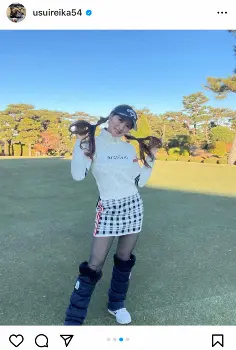 女子ゴルフ臼井麗香 冬のゴルフコーデ!ミニスカウエア姿披露に「ツインテール最高」「透明感半端ない」