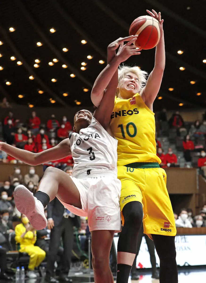 準決勝が行われ、ENEOSがトヨタ自動車に77―57で快勝し、10年連続27度目の優勝に王手をかけた。エースの渡嘉敷来夢(31)がともに両チーム最多となる32得点、17リバウンドと躍動。Wリーグ2連覇中の難敵を相手に圧倒的な存在感を示した。初優勝を目指すデンソーは富士通に74―56で勝利。決勝は18日に開催される。