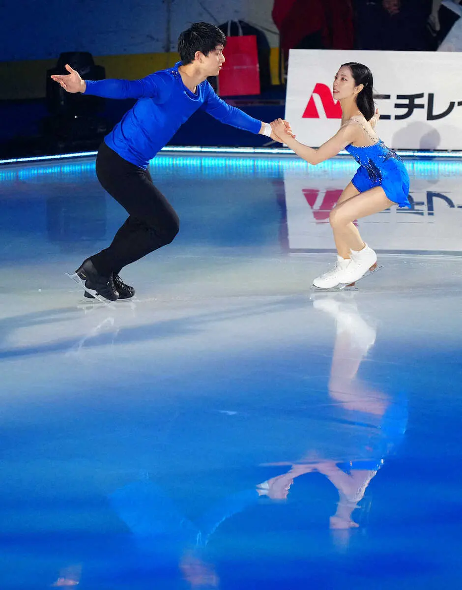来年3月の世界選手権(さいたまスーパーアリーナ)ペア代表の“りくりゅう”こと三浦璃来、木原龍一組(木下グループ)は青を基調としたアップテンポな「I Lived」を披露。3回転のツイストリフトやリフト、デススパイラルで会場を沸かせた。
