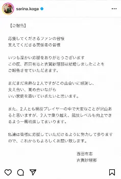 「応援してくださるファンの皆様 支えてくださる関係者の皆様 いつも温かい応援をありがとうございます この度、西田有志と古賀紗理那は結婚しましたことをご報告させていただきます。まだまだ未熟な2人ですがこの出会いに感謝し、支え合い、高め合いながらいい家庭を築いていきたいと思います。また、2人とも現役プレイヤーの中で大変なことが沢山あると思いますが、2人で乗り越え、競技レベルも向上できるよう一層精進してまいります。私達は皆様に応援していただけるように努力して参りますので、これからもよろしくお願い致します。西田有志 古賀紗理那」とした。