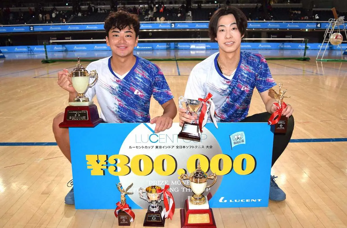 <ルーセントカップ第63回東京インドア全日本ソフトテニス大会>男子で18年以来2回目の優勝の船水(左)と上松組