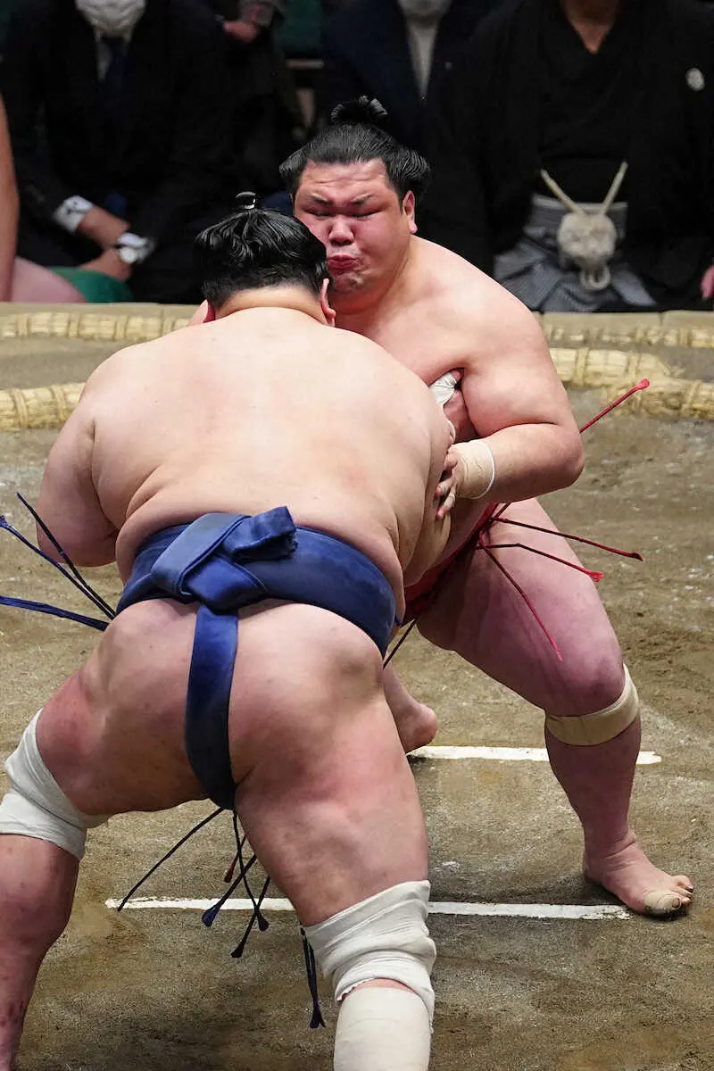 北勝富士戦は電車道の押し出しだった。右はず、左おっつけで、土俵際ではしっかり腰を落として相手のおなかを押す理想的取り口。同じ押し相撲の先輩に何もさせず、「しっかり当たって圧力を伝えようと考えた」と言葉に力を込めた。
