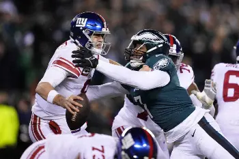 NFLプレーオフのNFC準決勝(ディビジョナル・プレーオフ)が21日にペンシルべニア州フィラデルフィアで行われ、第1シードのイーグルス(東地区1位=14勝3敗)が第6シードのジャイアンツ(東地区3位=9勝1分け7敗)を38―7(前半28―0)で下し、スーパーボウルを制した2017年シーズン以来となるNFC決勝進出を果たした。